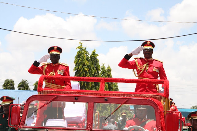 Mnadhimu Mkuu mstaafu wa Jeshi la Wananchi Tanzania (JWTZ), Luteni Jenerali Samuel Ndomba (kwenye gari kushoto) na Mkuu wa Vikosi vya Kulinda Amani Umoja wa Mataifa, Luteni Jenerali mstaafu, Paul Ignas Meela wakitoa heshima katika hafla ya kuagwa iliyofanyika Viwanja vya Twalipo Mgulani Dar es Salaam source : Jeshi la Wananchi wa TANZANIA ( JWTZ ) limewaaga Maofisa wake 16 Baada ya Kustaafu Kazi